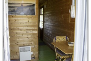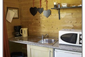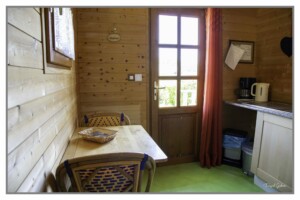 - Le coin repas comprend une table et deux chaises en bois, un évier, un réfrigérateur, un four à micro-ondes, eau courante.